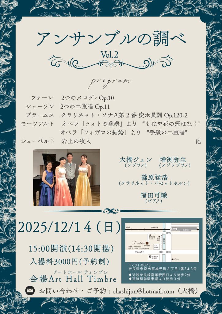 12月14日(日) アンサンブルの調べ Vol.2 大橋ジュン(ソプラノ) 増渕弥生(メゾソプラノ) 篠原猛浩(クラリネット・バセットホルン) 福田可織(ピアノ)